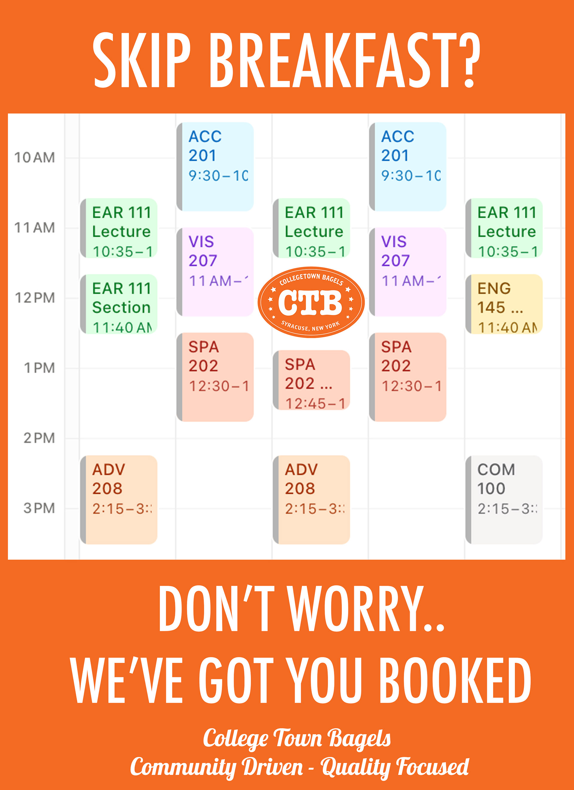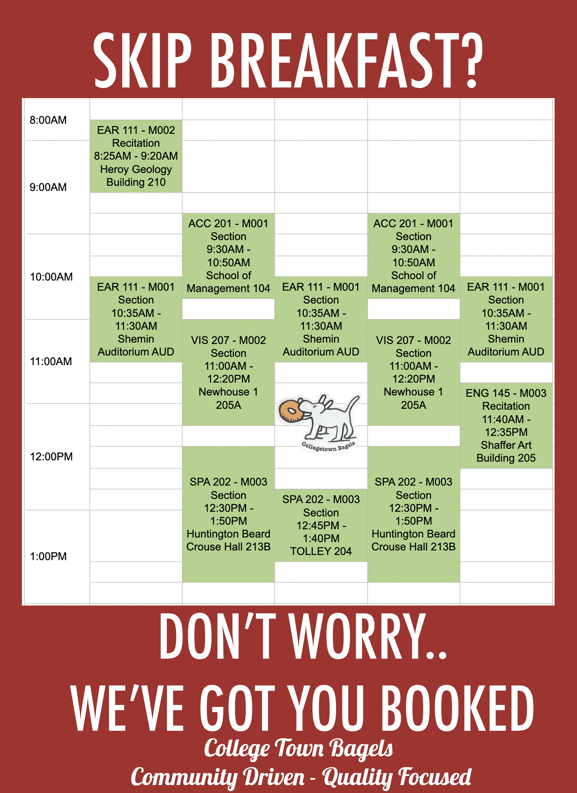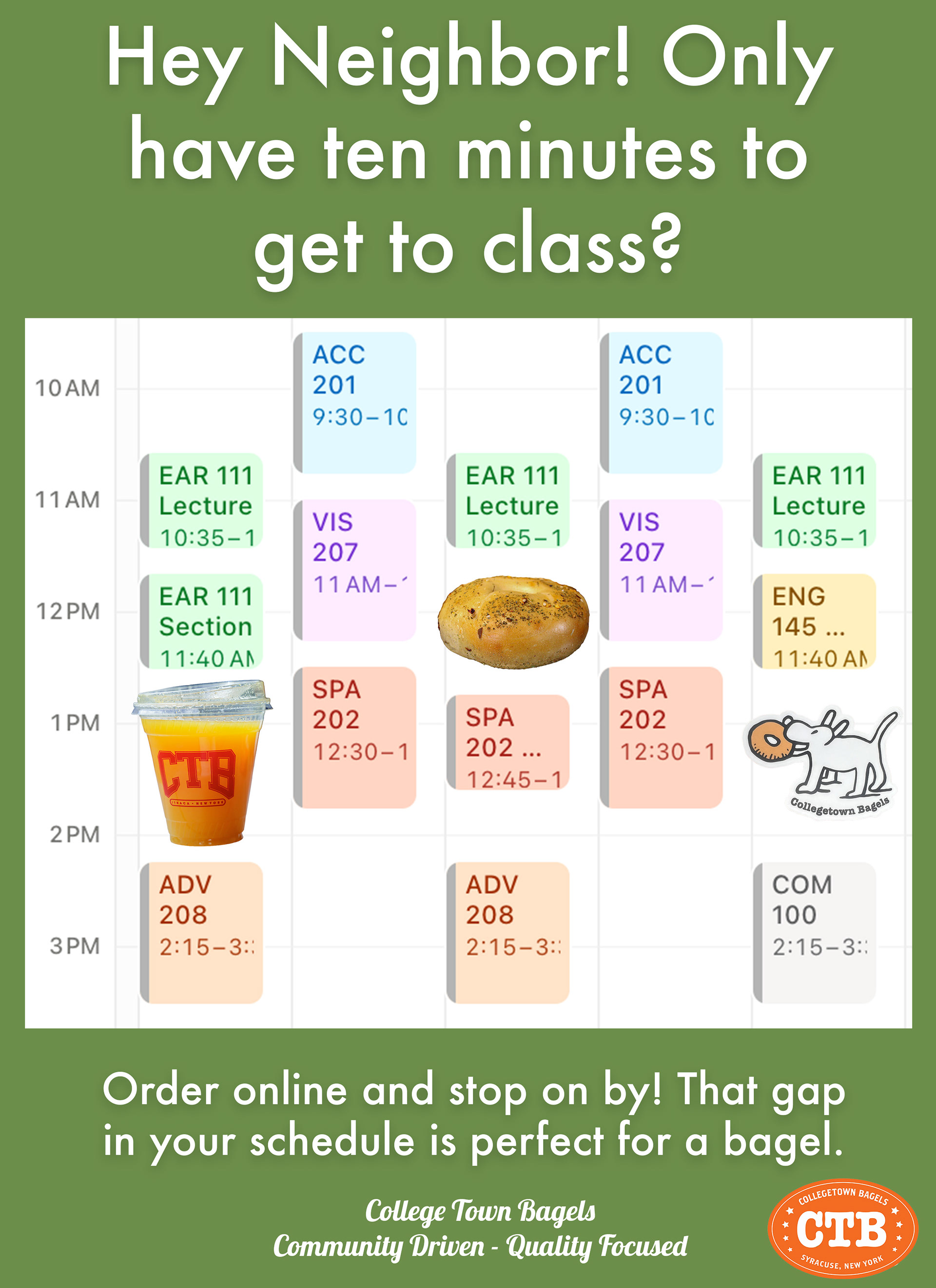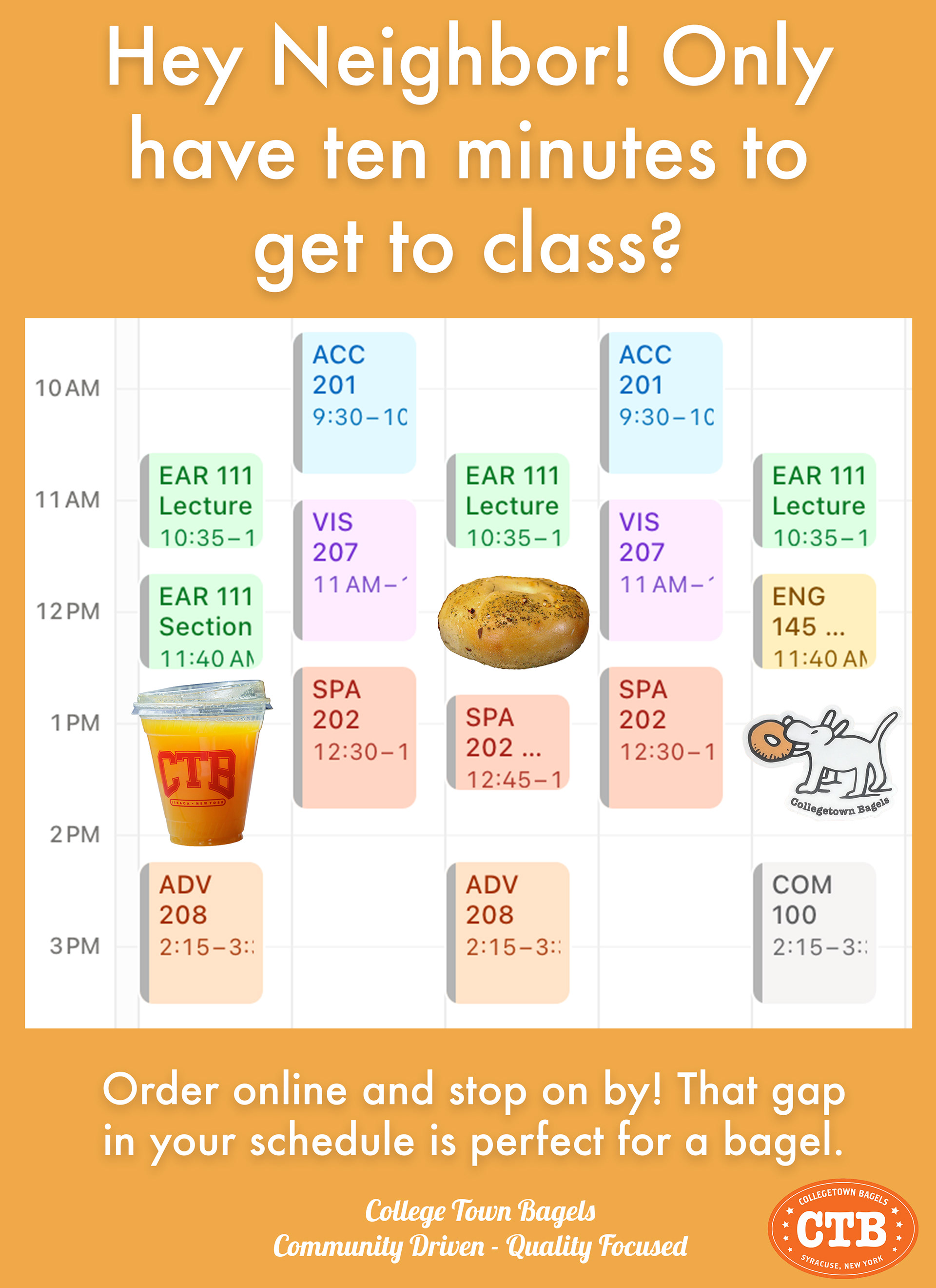 This work was done for Collegetown Bagels through TNH in August-December of 2025. As a member of creative I was tasked with mocking up print ads and creating social media content in the form of Instagram Reels. The final pitch deck was done in a team of 12 including everyone listed in the presentation. Our objective was to drive online sales and make content highlighting the local employees.